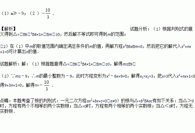 (2)如果m取符合条件的最小整数,且一元二次方程x2﹣6x﹣m=0与x2+nx+1=0有一个相同的根,求常数n的值.