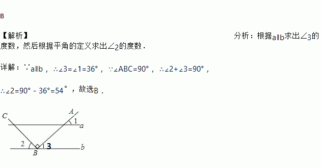 如图,a∥b,点B在直线b上,且AB⊥BC,若∠1=36°,则∠2的大小为( )