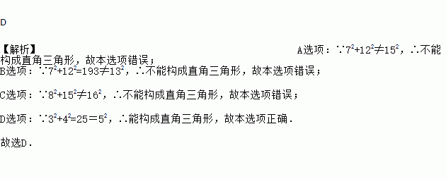 D 【解析】A选项:∵72+122≠152,∴不能构成直角三角形,故本选项错误; B选项:∵72+122=193≠132,∴不能构成直角三角形,故本选项错误; C选项:∵82+152≠162,∴不能构成直角三角形,故本选项错误; D选项:∵32+42=25=52,∴能构成直角三角形,故本选项正确. 故选D.