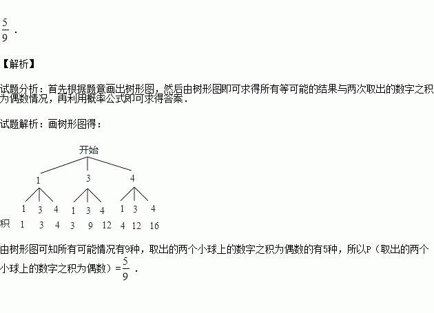 一个不透明的口袋里有三个小球,上面分别标有数字1,3,4,每个小球除数字外其他都相同,甲先从口袋中随机取出1个小球,记下数字后放回,乙再从口袋中随机取出1个小球记下数字,用画树状图(或列表)的方法,求取出的两个小球上的数字之积为偶数的概率.