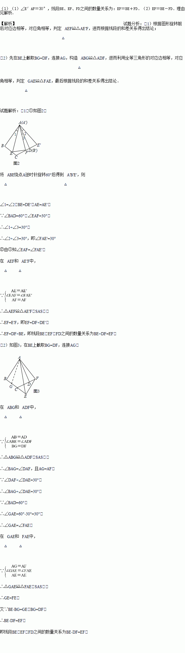 £¨1£©Èçͼ2£¬½«¡÷ABEÈÆµãAÄæÊ±ÕëÐýת60¡ãºóµÃµ½¡÷A¡äB¡äE¡ä£¨A¡äB¡äÓëADÖØºÏ£©£¬ÄÇô¢Ù¡ÏE¡äAF¶ÈÊý___________________¢ÚÏß¶ÎBE¡¢EF¡¢FDÖ®¼äµÄÊýÁ¿¹ØÏµ____________________