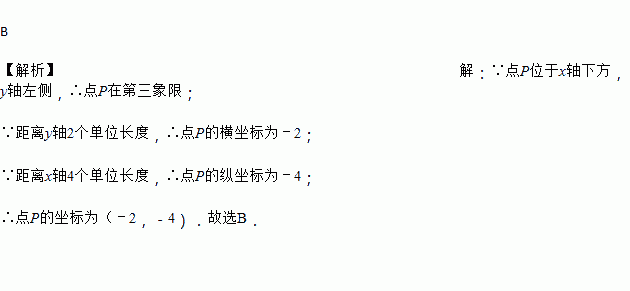 点P位于x轴下方,y轴左侧,距离x轴4个单位长度,距离y轴2个单位长度,那么点P的坐标是( )