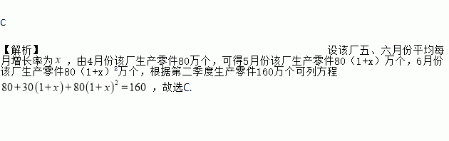 某机械厂4月份生产零件80万个,第二季度生产零件160万个.设该厂五、六月份平均每月增长率为,那么满足的方程是( )