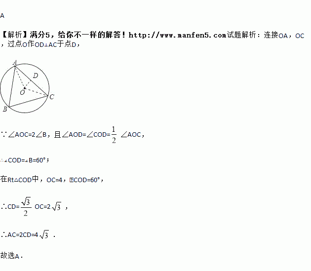 如图,⊙O是△ABC的外接圆,∠B=60°,⊙O的半径为4,则AC的长等于( )