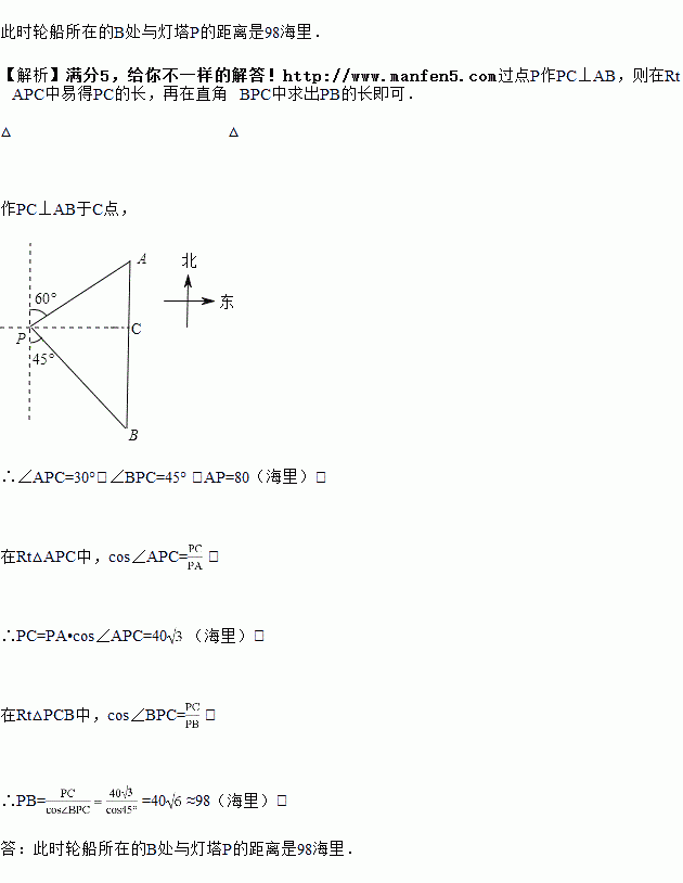 如图,一艘轮船位于灯塔P的北偏东60°方向,与灯塔P的距离为80海里的A处,它沿正南方向航行一段时间后,到达位于灯塔P的南偏东45°方向的B处,求此时轮船所在的B处与灯塔P的距离.(参考数据: