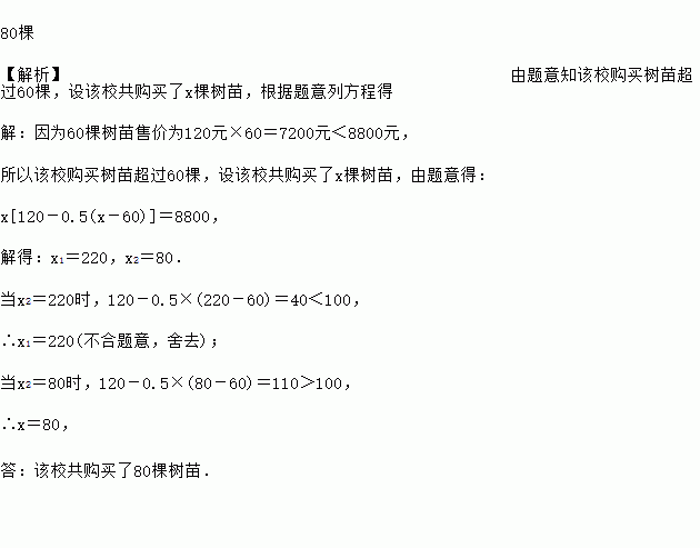 一学校为了绿化校园环境,向某园林公司购买力一批树苗,园林公司规定:如果购买树苗不超过60棵,每棵售价120元;如果购买树苗超过60棵,每增加1棵,所出售的这批树苗每棵售价均降低0.5元,但每棵树苗最低售价不得少于100元,该校最终向园林公司支付树苗款8800元,请问该校共购买了多少棵树苗?