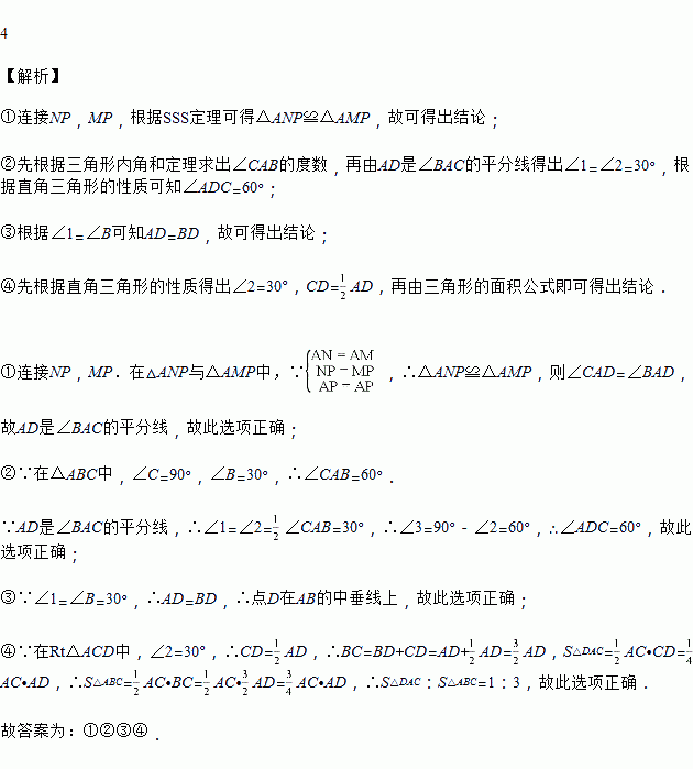 MN的长为半径画弧,两弧交于点P,连接AP并延长交BC于点D,则下列说法:①AD是∠BAC的平分线;②∠ADC=60°;③点D在AB的垂直平分线上;④S△DAC:S△ABC=1:3.其中正确的是__________________.(填所有正确说法的序号)