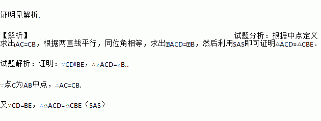 已知:如图,点C为AB中点,CD=BE,CD∥BE.求证:△ACD≌△CBE.