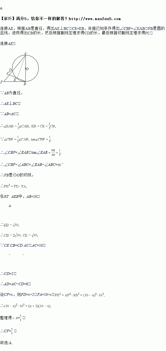 如图,在△ABC中,AB=AC=10,以AB为直径的⊙O分别交AC、BC于点D、E,点F在AC的延长线上,且∠CBF=