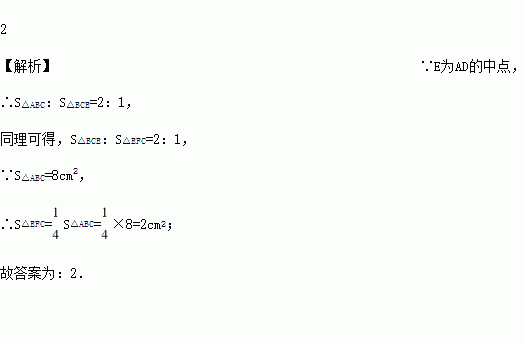 如图,在△ABC中,已知点D为BC上一点,E,F分别为AD,BE的中点,且S△ABC=8cm2,则图中阴影部分△CEF的面积是_____cm2.