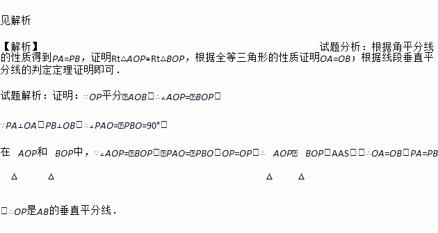 如图,已知OP平分∠AOB,PA⊥OA,PB⊥OB,垂足分别为A,B.求证:OP是AB的垂直平分线.
