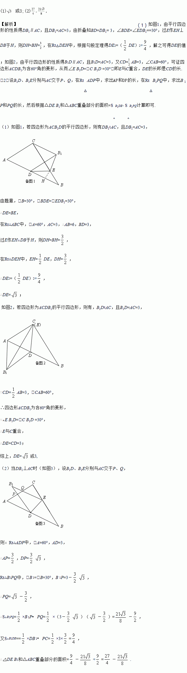 (1)当A、D、B1、C构成的四边形为平行四边形,求DE的长;