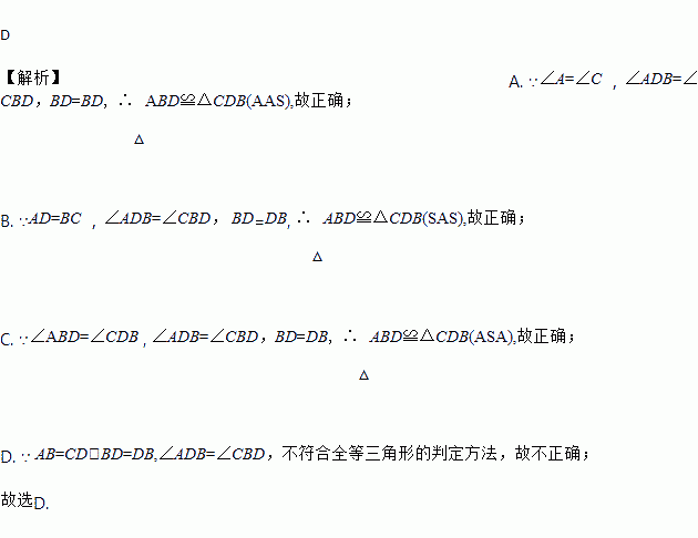 D 【解析】A. ∵∠A=∠C ,∠ADB=∠CBD,BD=BD, ∴△ABD≌△CDB(AAS),故正确; B. ∵AD=BC ,∠ADB=∠CBD, BD=DB, ∴△ABD≌△CDB(SAS),故正确; C. ∵∠ABD=∠CDB , ∠ADB=∠CBD,BD=DB, ∴△ABD≌△CDB(ASA),故正确; D. ∵ AB=CD,BD=DB,∠ADB=∠CBD,不符...