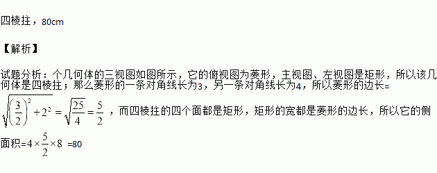 一个几何体的三视图如图所示,它的俯视图为菱形 请写出该几何体的形状,并根据图中所给的数据求出它的侧面积