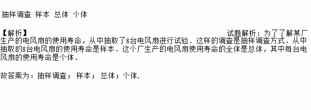 为了了解某厂生产的电风扇的使用寿命,从中抽取了8台电风扇进行试验.这样的调查是________方式.从中抽取的8台电风扇的使用寿命是______.这个厂生产的电风扇使用寿命的全体是______________,其中每台电风扇的使用寿命是____________.