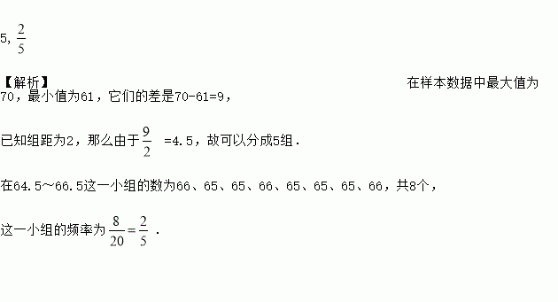 5, 【解析】在样本数据中最大值为70,最小值为61,它们的差是70-61=9, 已知组距为2,那么由于 =4.5,故可以分成5组. 在64.5~66.5这一小组的数为66、65、65、66、65、65、65、66,共8个, 这一小组的频率为.