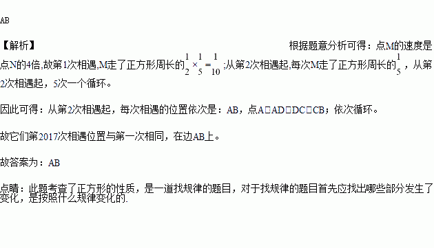 已知正方形ABCD,M、N两动点分别从A、C两点同时出发沿正方形的边开始移动,点M按逆时针方向移动,点N按顺时针方向移动,若点M的速度是点N的4倍,则它们第2017次相遇在边________上.