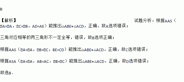 B 【解析】试题分析:根据AAS(∠A=∠A,∠C=∠B,AD=AE)能推出△ABE≌△ACD,正确,故A选项错误; 三角对应相等的两三角形不一定全等,错误,故B选项正确; 根据AAS(∠A=∠A,∠B=∠C,BE=CD)能推出△ABE≌△ACD,正确,故C选项错误; 根据ASA(∠A=∠A,AB=AC,∠B=∠C)能推出△ABE≌△ACD,正确,故D选项错误; 故选...