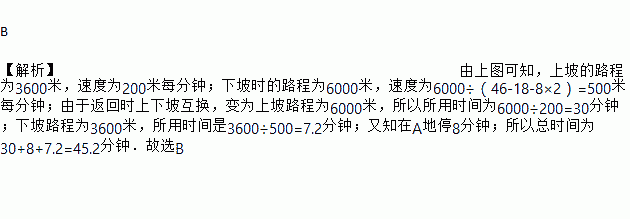 B 【解析】由上图可知,上坡的路程为3600米,速度为200米每分钟;下坡时的路程为6000米,速度为6000÷(46-18-8×2)=500米每分钟;由于返回时上下坡互换,变为上坡路程为6000米,所以所用时间为6000÷200=30分钟;下坡路程为3600米,所用时间是3600÷500=7.2分钟;又知在A地停8分钟;所以总时间为30+8+7.2=45.2分钟.故选B