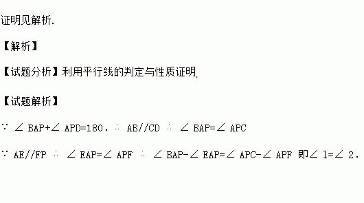 如图,∠BAP+∠APD=180°,AE//FP,求证:∠1=∠2.