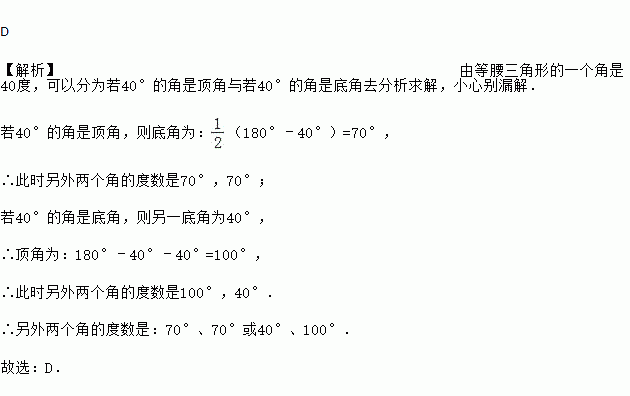 等腰三角形中有一个角是40°,则另外两个角的度数是( )