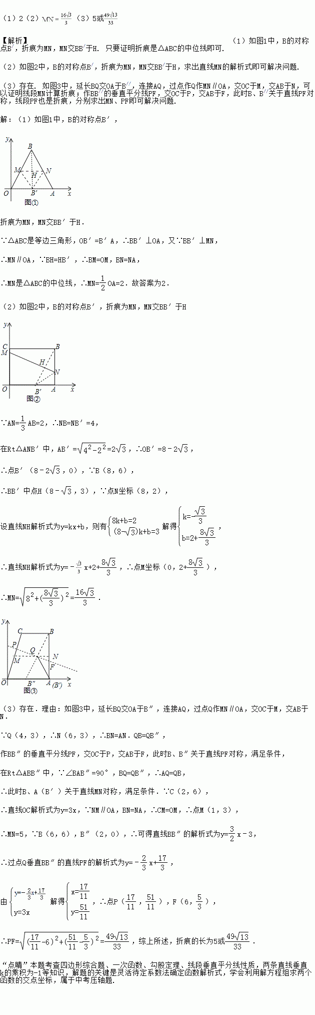 (1)如图①,边长为4的等边△OAB位于平面直角坐标系中,将△OAB折叠,使点B落在OA的中点处,则折痕长为_ __;