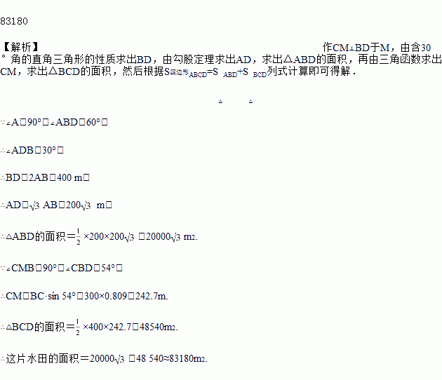 如图,四边形ABCD是一片水田,某村民小组需计算其面积,测得如下数据:∠A=90°,∠ABD=60°,∠CBD=54°,AB=200 m,BC=300 m.请你计算出这片水田的面积.(参考数据:sin 54°≈0.809,cos 54°≈0.588,tan 54°≈1.376,