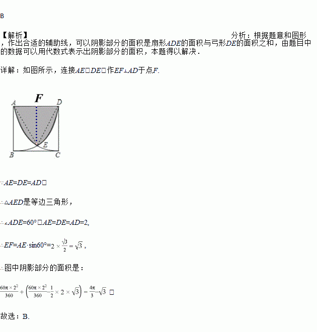 如图,在正方形ABCD中,边长AD=2,分别以顶点A、D为圆心,线段AD的长为半径画弧交于点E,则图中阴影部分的面积是( )