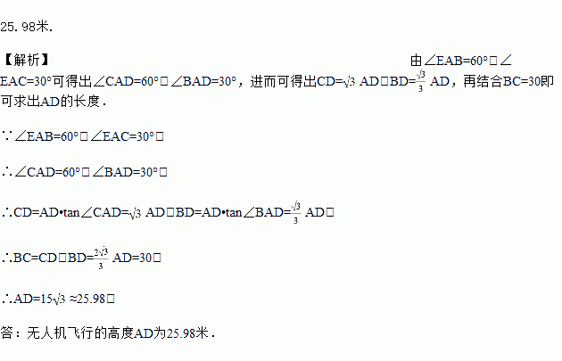 小亮在某桥附近试飞无人机,如图,为了测量无人机飞行的高度AD,小亮通过操控器指令无人机测得桥头B,C的俯角分别为∠EAB=60°,∠EAC=30°,且D,B,C在同一水平线上.已知桥BC=30米,求无人机飞行的高度AD.(精确到0.01米.参考数据: