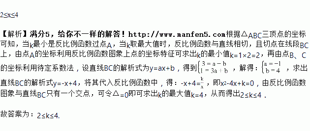 如图,△ABC的三个顶点分别为A(1,2),B(1,3),C(3,1).若反比例函数在第一象限内的图象与△ABC有公共点,则k的取值范围是________.