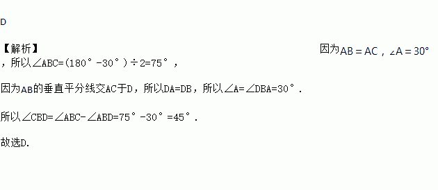 D 【解析】因为AB=AC,∠A=30°,所以∠ABC=(180°-30°)÷2=75°, 因为AB的垂直平分线交AC于D,所以DA=DB,所以∠A=∠DBA=30°. 所以∠CBD=∠ABC-∠ABD=75°-30°=45°. 故选D.