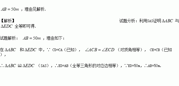 有一座锥形小山,如图,要测量锥形小山两端A、B的距离,先在平地上取一个可以直接到达A和B的点C,连接AC并延长到D,使CD=CA,连接BC并延长到E,使CE=CB,连接DE,量出DE的长为50m,你能求出锥形小山两端A、B的距离吗?
