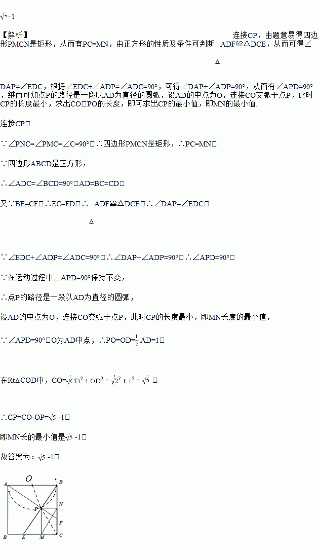 如图点E、F分别是边长为2的正方形ABCD边BC、CD上的动点,且BE=CF,连接DE、AF相交于P点,作PN⊥CD于N点,PM⊥BC于M点,连接MN,则MN长的最小值为__.