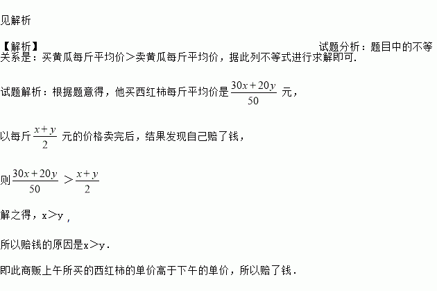 ijÉÌ··È¥²Ë̯ÂòÎ÷ºìÊÁ£¬ËûÉÏÎçÂòÁË30½ï£¬¼Û¸ñΪÿ½ïxÔª£»ÏÂÎ磬ËûÓÖÂòÁË20½ï£¬¼Û¸ñΪÿ½ïyÔª£¬ºóÀ´ËûÒÔÿ½ï