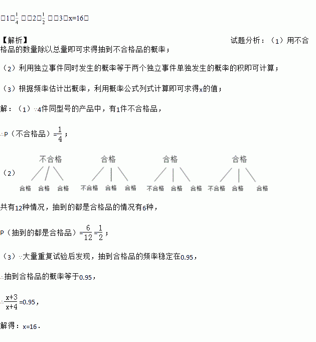 £¨3£©ÔÚÕâ4¼þ²úÆ·ÖмÓÈëx¼þºÏ¸ñÆ·ºó£¬½øÐÐÈçÏÂÊÔÑé£ºËæ»ú³éÈ¡1¼þ½øÐмì²â£¬È»ºó·Å»Ø£¬¶à´ÎÖØ¸´Õâ¸öÊÔÑ飬ͨ¹ý´óÁ¿Öظ´ÊÔÑéºó·¢ÏÖ£¬³éµ½ºÏ¸ñÆ·µÄƵÂÊÎȶ¨ÔÚ0.95£¬Ôò¿ÉÒÔÍÆËã³öxµÄÖµ´óÔ¼ÊǶàÉÙ£¿