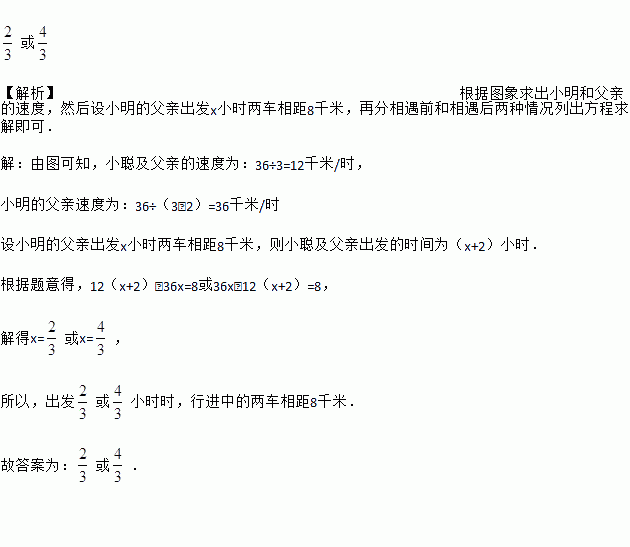 甲乙两地相距50千米.星期天上午8:00小聪同学在父亲陪同下骑山地车从甲地前往乙地.2小时后,小明的父亲骑摩托车沿同一路线也从甲地前往乙地,他们行驶的路程y(千米)与小聪行驶的时间x(小时)之间的函数关系如图所示,小明父亲出发 小时时,行进中的两车相距8千米.