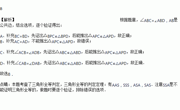 如图,点P是AB上任意一点,∠ABC=∠ABD,还应补充一个条件,才能推出△APC≌△APD.从下列条件中补充一个条件,不一定能推出△APC≌△APD的是