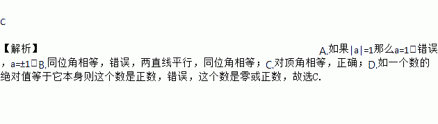 C. 对顶角相等 D. 如一个数的绝对值等于它本身则这个数是正数
