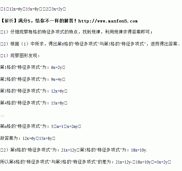 我们把每个图形中字母的和所得的多项式称为特征多项式,例如第1格的“特征多项式”为6x+2y,