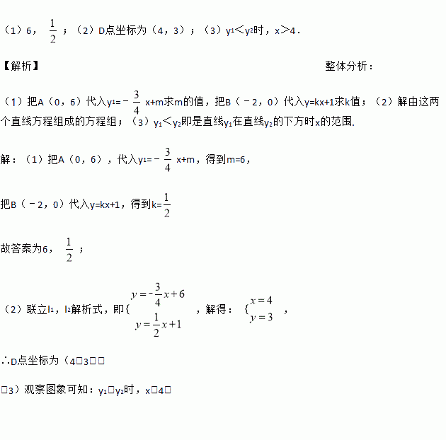 x+m与y轴交于点A(0,6),直线l2:y=kx+1分别与x轴交于点B(﹣2,0),与y轴交于点C,两条直线交点记为D.