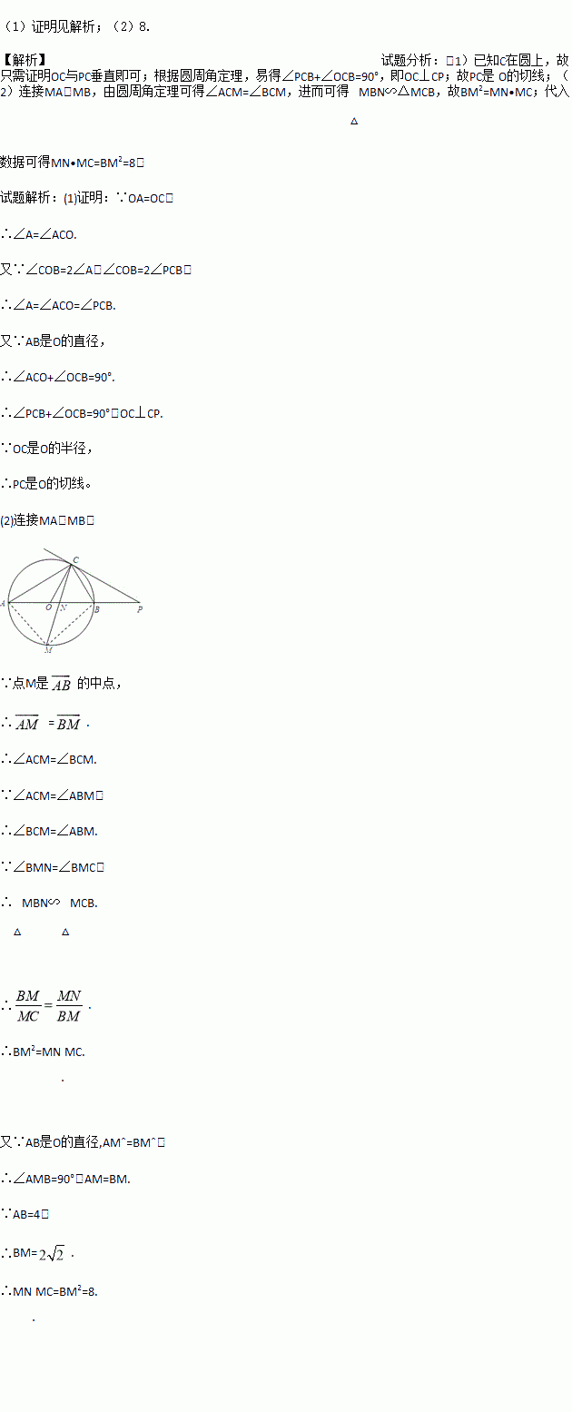 (2)点M是弧AB的中点,CM交AB于点N,若AB=4,求MN·MC的值.