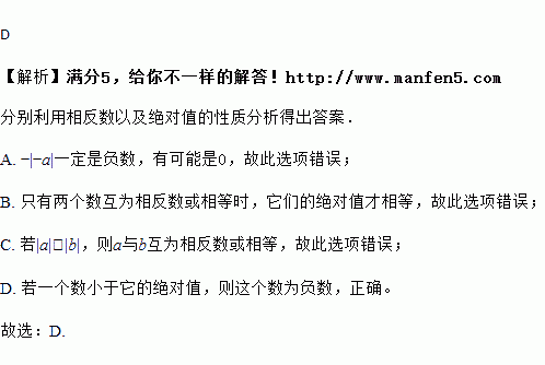 A. -|a|一定是负数 B. 只有两个数相等时,它们的绝对值才相等