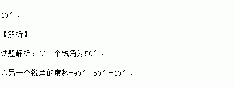 若直角三角形的一个锐角为50°,则另一个锐角的度数是 度.