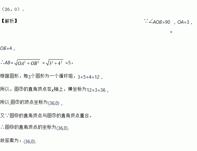 如图①为Rt△AOB,∠AOB=90°,其中OA=3,OB=4.将AOB沿x轴依次以A,B,O为旋转中心顺时针旋转.分别得图②,图③,…,则旋转到图⑩时直角顶点的坐标是_____.
