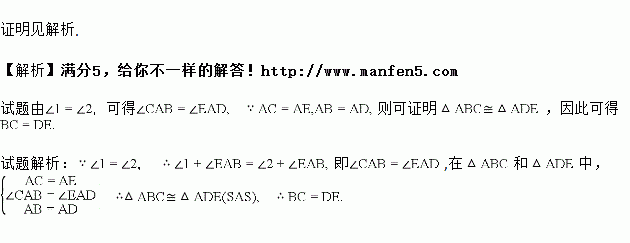 如图所示,AC=AE,∠1=∠2,AB=AD.求证:BC=DE.