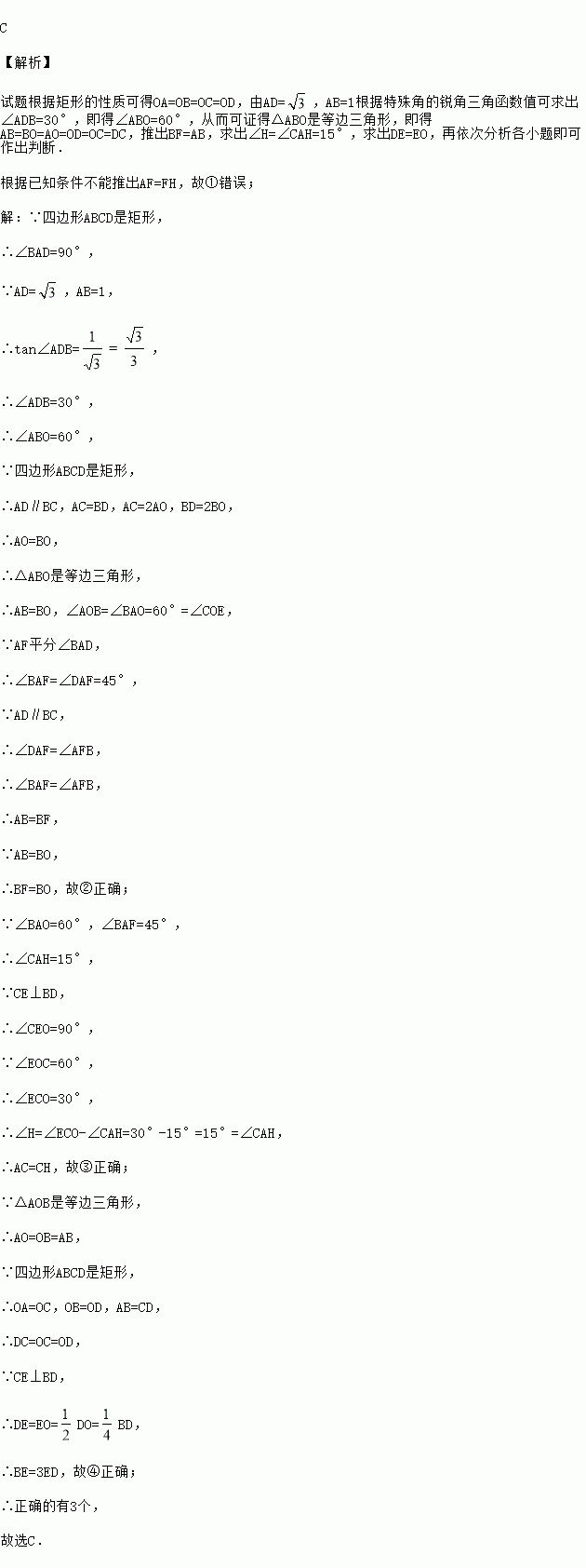 BD于E,延长AF、EC交于点H,下列结论中:①AF=FH;②B0=BF;③CA=CH;④BE=3ED;正确的个数为( )