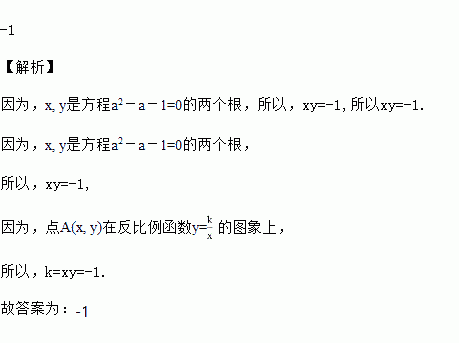 反比例函数y=的图象上有一点A(x, y),且x, y是方程a2-a-1=0的两个根,则k=_________.