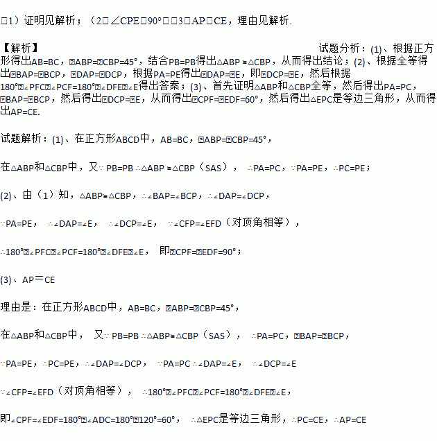 (3)如图②,把正方形ABCD改为菱形ABCD,其他条件不变,当∠ABC=120°时,连接CE,试探究线段AP与线段CE的数量关系,并说明理由.