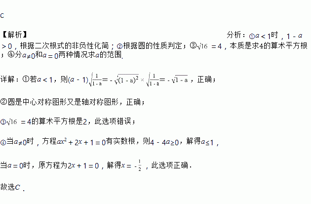 的算术平方根是4;④如果方程ax2+2x+1=0有实数根,则实数a≤1.其中正确的命题个数是( )