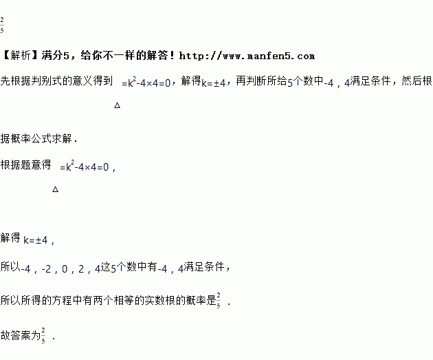 从、、、、这个数中任取一个数,作为关于的一元二次方程的值,则所得的方程中有两个相等的实数根的概率是________.